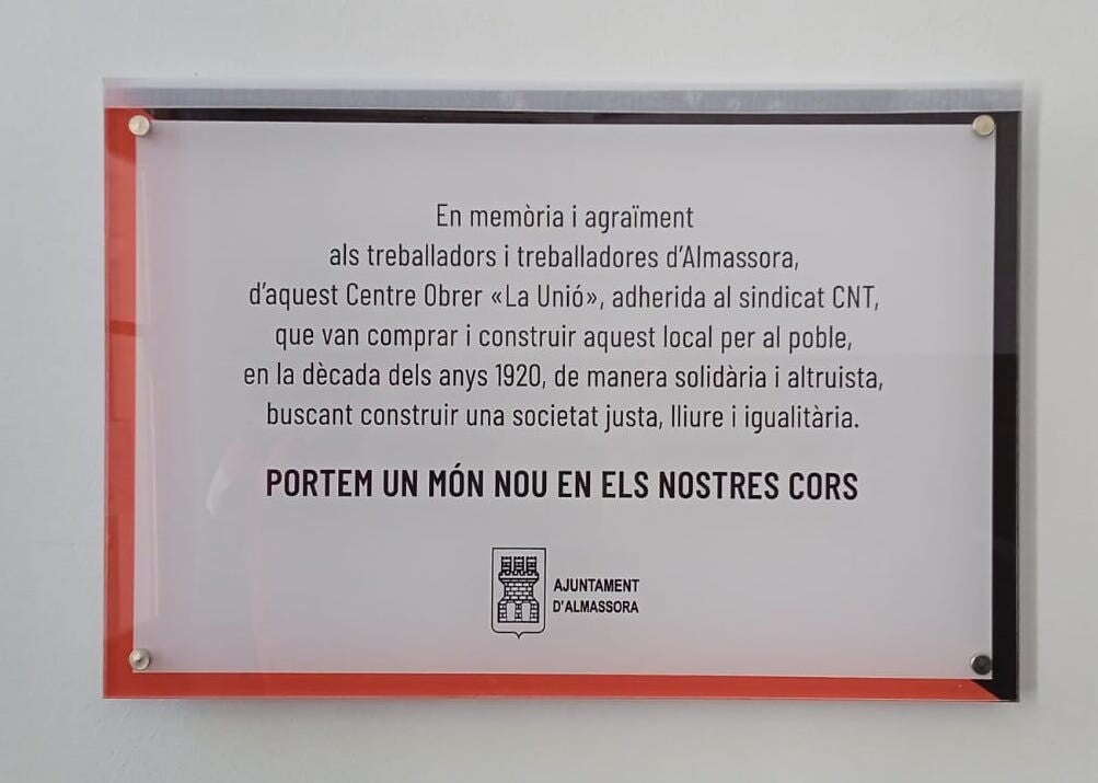 A petició del Grup per la Recerca de la Memòria Històrica a Castelló (GRMHC), aquest dimecres s’ha col·locat una placa commemorativa al Casal Jove d’Almassora (la Plana Alta) en memòria del Centre Obrer «La Unió», adherit a la CNT, que va construir l’edifici per al poble en la dècada del 1920 «de manera solidària i altruista, buscant construir una societat justa, altruista i igualitària».