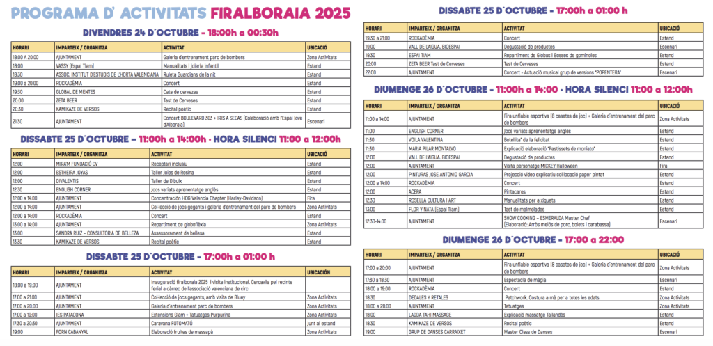 Amb aquesta nova edició, Alboraia reafirma el seu suport al comerç local, a la cultura participativa i a la dinamització econòmica del municipi, convertint FirAlboraia en un punt de trobada entre tradició, gastronomia i creativitat per a tots els públics.