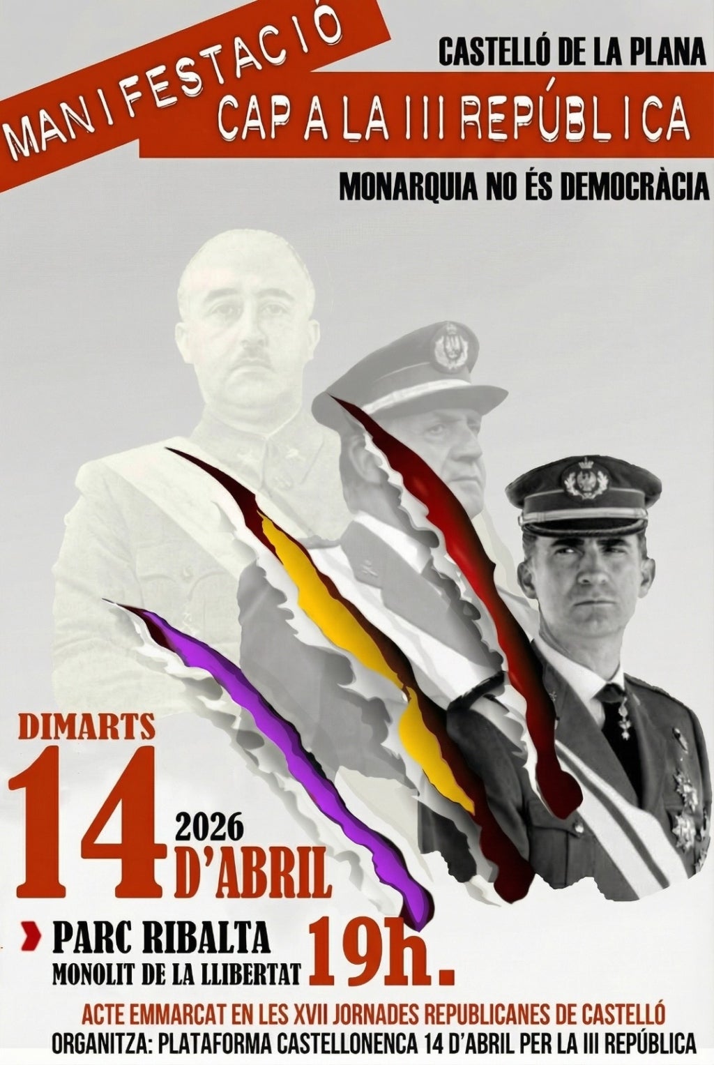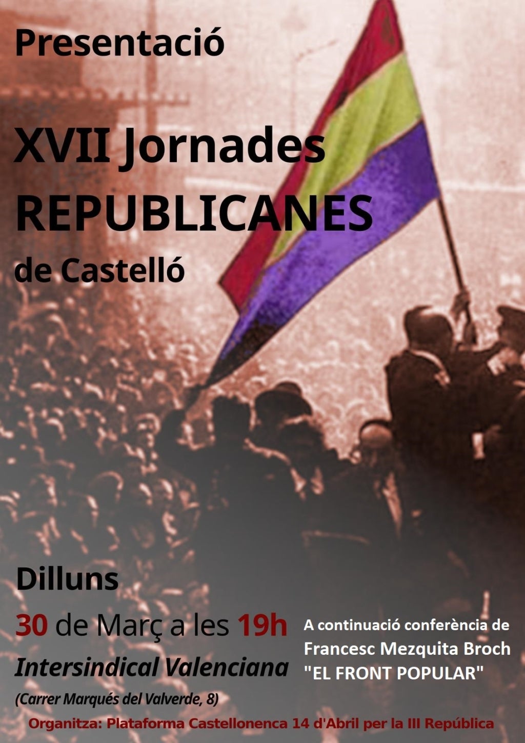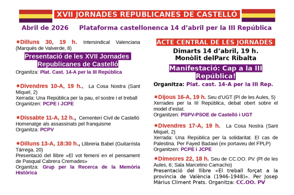 Castelló de la Plana acull les XVII Jornades Republicanes, organitzades per la Plataforma castellonenca 14 d’abril per la III República, amb nombroses activitats polítiques, culturals i memorialístiques fins al 22 d’abril.