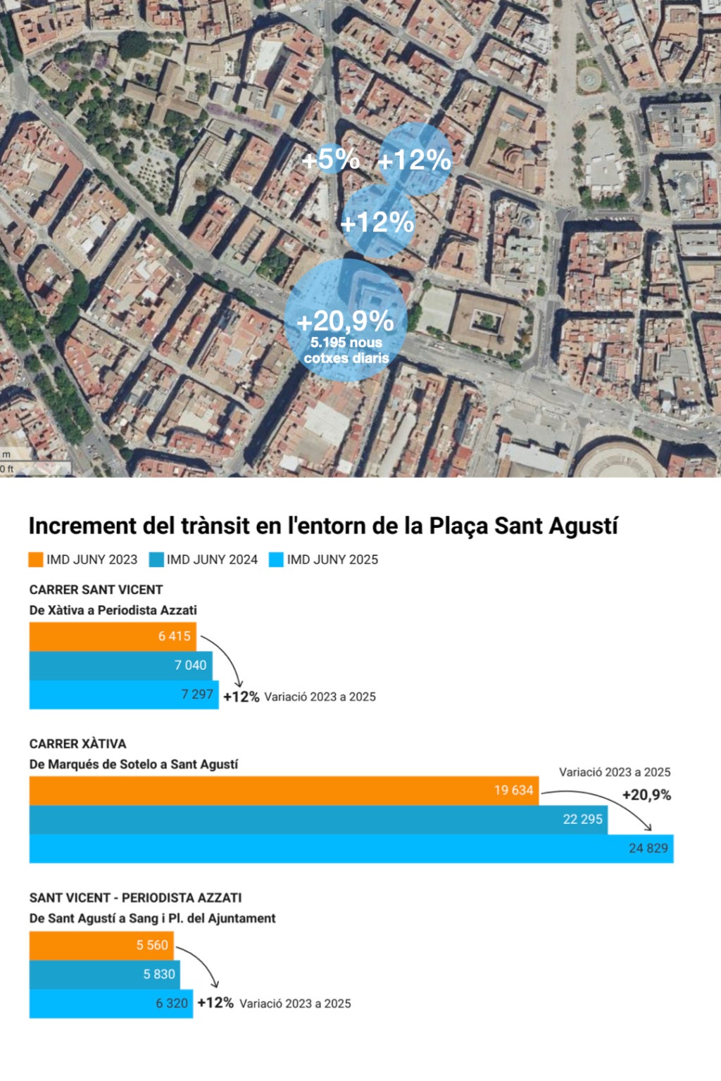 Segons dades oficials d’intensitat mitjana diària (IMD) recollides per l’Ajuntament, encapçalat per M. José Catalá, el trànsit al tram del carrer de Xàtiva entre Marqués de Sotelo i Sant Agustí ha passat de 19.634 vehicles diaris en 2023 a 24.829 en 2025, un augment del 20,9% —5.195 cotxes més cada dia-. També s’han registrat increments del 12% en trams de Sant Vicent i de Periodista Azzati, i fins a un 5% en altres punts pròxims. “Catalá va arribar al govern i al cap de pocs mesos va introduir canvis per a afavorir de nou el pas dels cotxes pel carrer de Colom i altres vies del centre de València. El resultat és el que veiem: en dos anys s’ha disparat el trànsit; no es pot protegir els vianants ni potenciar el transport públic amb polítiques que aposten pel cotxe i la contaminació”, ha criticat Robles.