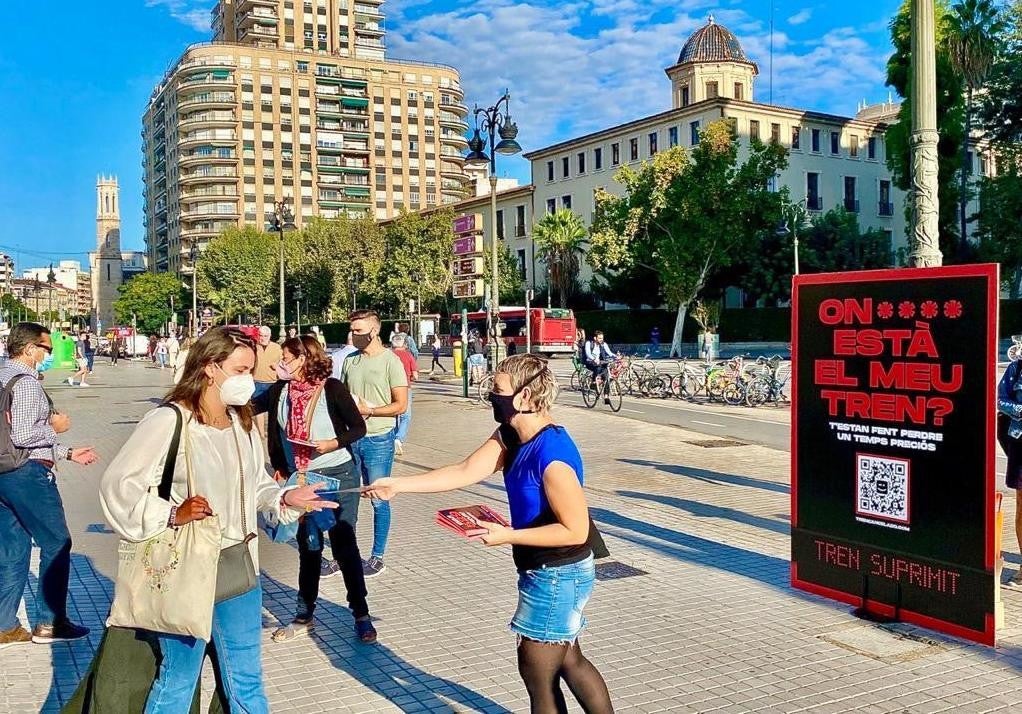 Amb motiu de la celebració del Dia Internacional Sense Cotxe, Compromís ha volgut visibilitzar el negligent servei de rodalies valencià gestionat per Renfe, amb el repartiment de més de 2.000 fullets informatius davant de les diferents estacions de tren. El repartiment s’engloba dins de la campanya «trencancelado.com» que defensa el dret dels valencians a tindre un servei de rodalies digne.