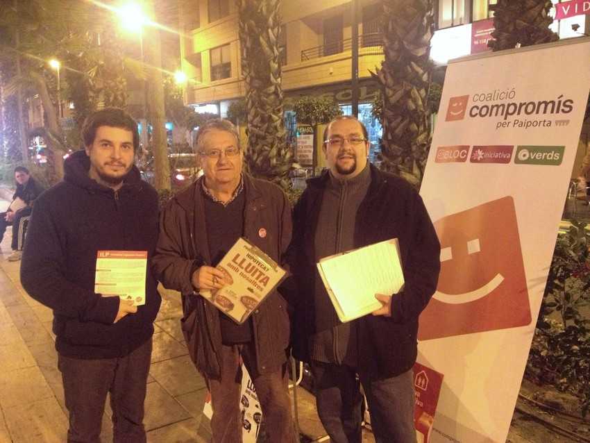 El col·lectiu de Compromís per Torrent va apurar fins als últims instants i el passat divendres 11 de gener va tancar la campanya de recollida de signatures en favor de la Iniciativa Legislativa Popular (ILP) per parar els desnonaments promoguts per la Plataforma d’Afectats per la Hipoteca.