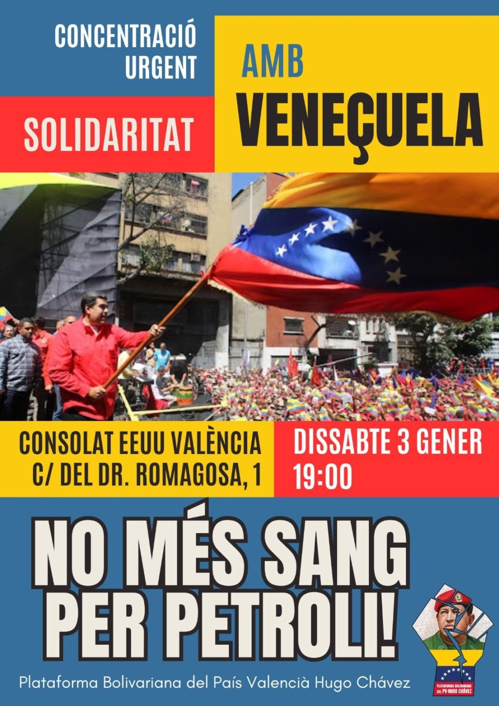 Els bombardeigs i agressions militars dels EUA a Veneçuela estan tenint també repercussió a València. Malgrat que per l’augment de la tensió a la zona ja s’havia convocat una primera mobilització per al 8 de gener, ara la Plataforma Bolivariana del País Valencià -conformada per diferents sindicats, partits i col·lectius antimilitaristes i de solidaritat internacional- ha optat per convocar-ne una altra amb caràcter d’urgència després que aquest matí l’exèrcit dels EUA haja atacat violentament Veneçuela, amb bombardeigs en diferents instal·lacions civils i militars, així com altres tipus d’atacs.