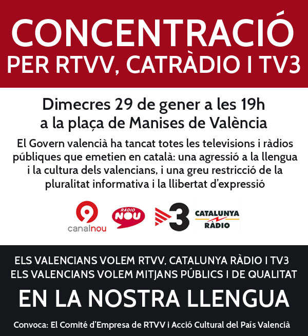 El Comitè d’Empresa de RTVV i Acció Cultural del País Valencià (ACPV) convoquen tothom el dimecres 29 de gener a les 19 hores a la plaça de Manises de València a un acte conjunt d’afirmació de la llibertat i de denúncia de la censura.