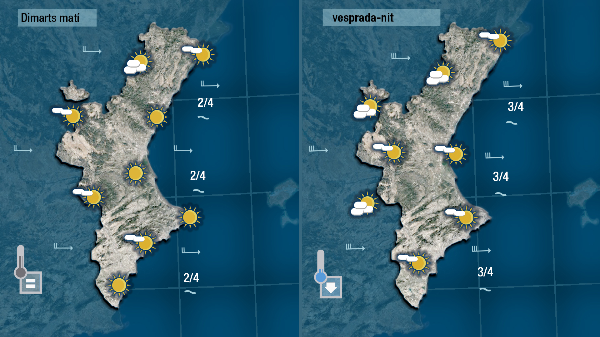 Així mateix, el sud del País Valencià registrarà temperatures altes, que a la costa arribaran als 30 graus. El vent de ponent continuarà secant l’ambient, però amb el pas del front el cel s’ennuvolarà lleugerament. Les temperatures es mantindran així fins dijous, quan podríem començar a notar canvis amb l’entrada del vent de llevant.