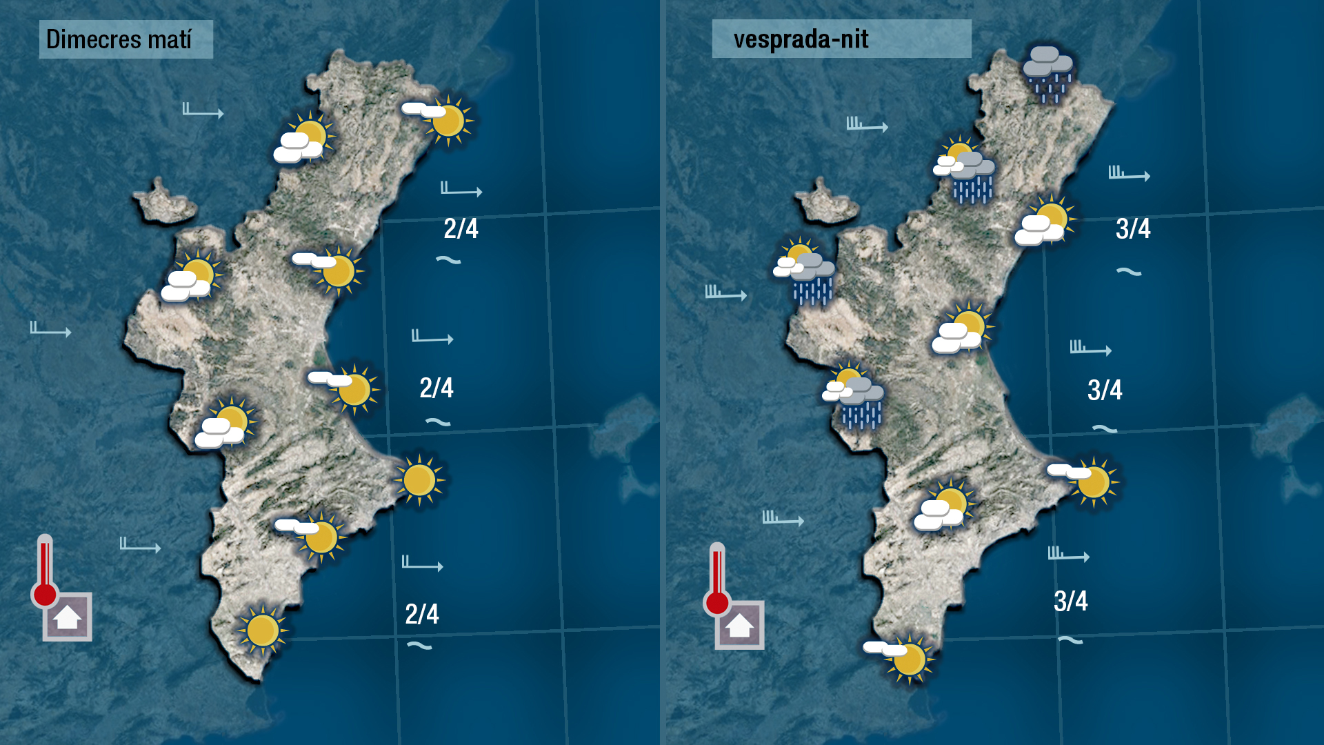 Demà, dimecres 9 d’octubre, serà un dia protagonitzat pel ponent i per un nou ascens tèrmic, que ens permetrà anar lleugers de roba durant tot el dia. No serà necessari eixir amb paraigua, ja que només podríem tindre alguna pluja molt dèbil a última hora de la nit o ja de matinada.