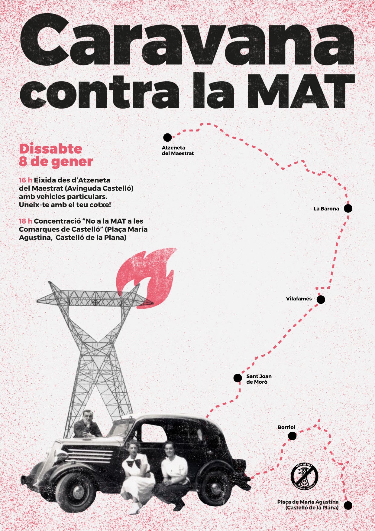 La Plataforma No a la MAT de les comarques valencianes del nord ha convocat aquest dissabte una caravana de cotxes en protesta contra el projecte d’instal·lació d’una línia de molt alta tensió (MAT) amb torres de més de 45 metres d’altura. La comitiva eixirà a les 16 hores d’Atzeneta del Maestrat i conclourà a la plaça de Maria Agustina de Castelló de la Plana.