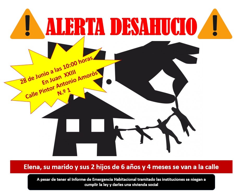 Col·lectius socials d’Alacant han convocat per a demà dimecres dia 28 de juny una concentració per a evitar el desnonament decretat contra Elena, el seu marit i els fills compartits per aquesta parella, que tenen sis anys i quatre mesos de vida. Els quatre es poden quedar al carrer si l’execució hipotecària s’acaba aplicant.