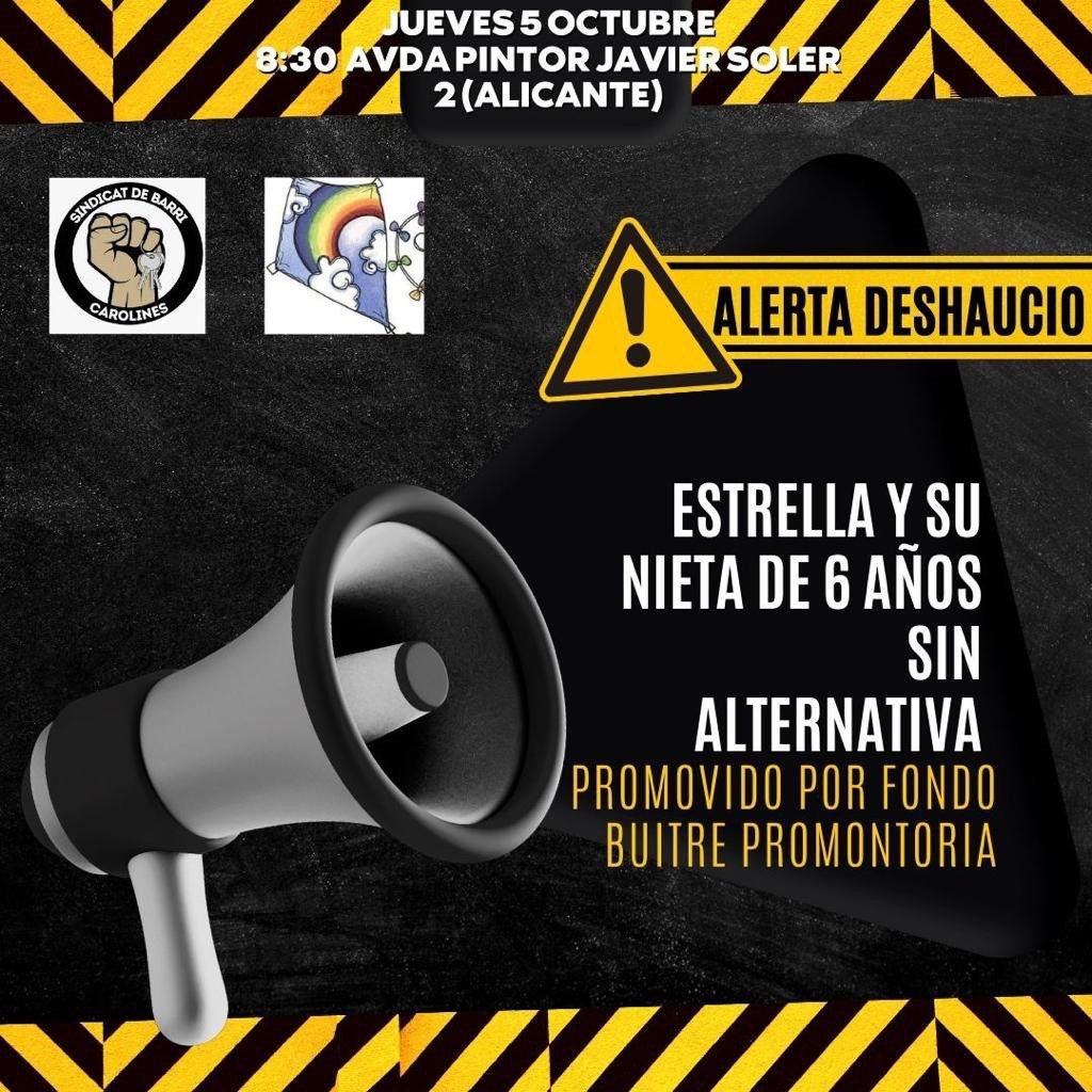 Diverses entitats socials d’Alacant han convocat una concentració aquest dijous 5 d’octubre des de les 8.30 del matí contra el desnonament que hi ha convocat contra una família vulnerable. En concret, Estrella i la seua neta de sis anys podrien ser expulsades de casa sense tindre cap alternativa habitacional. La denúncia l’ha formulada el fons voltor Promontoria.