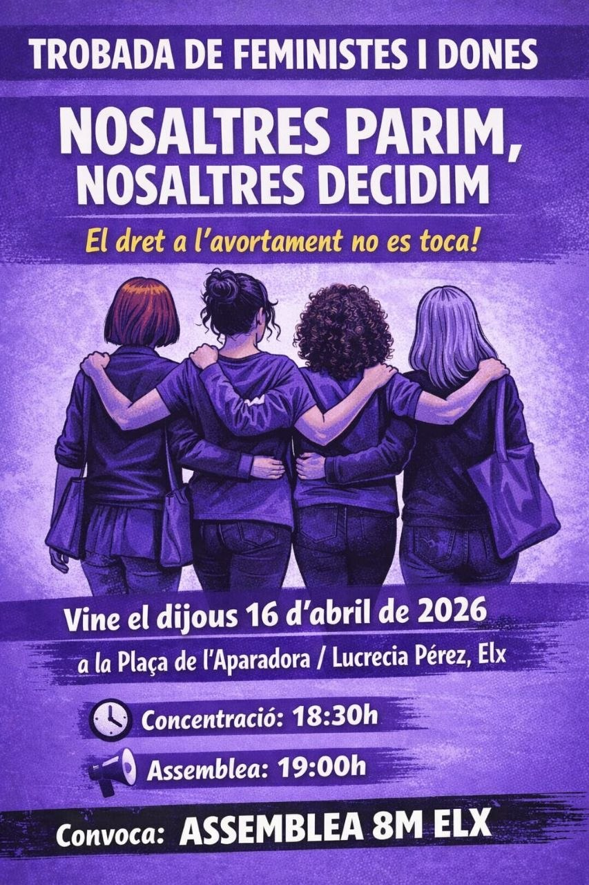 L’Assemblea 8M d’Elx ha convocat per al dijous 16 d’abril una concentració-assemblea en defensa del dret a l’avortament, sota el lema “Nosaltres parim, nosaltres decidim” i amb el missatge clar que “El dret a l’avortament no es toca”. La trobada tindrà lloc a la plaça de l’Aparadora / Lucrecia Pérez d’Elx (el Baix Vinalopó), on la convocatòria arrancarà a les 18.30 hores amb una concentració i continuarà a les 19.00 amb una assemblea oberta.