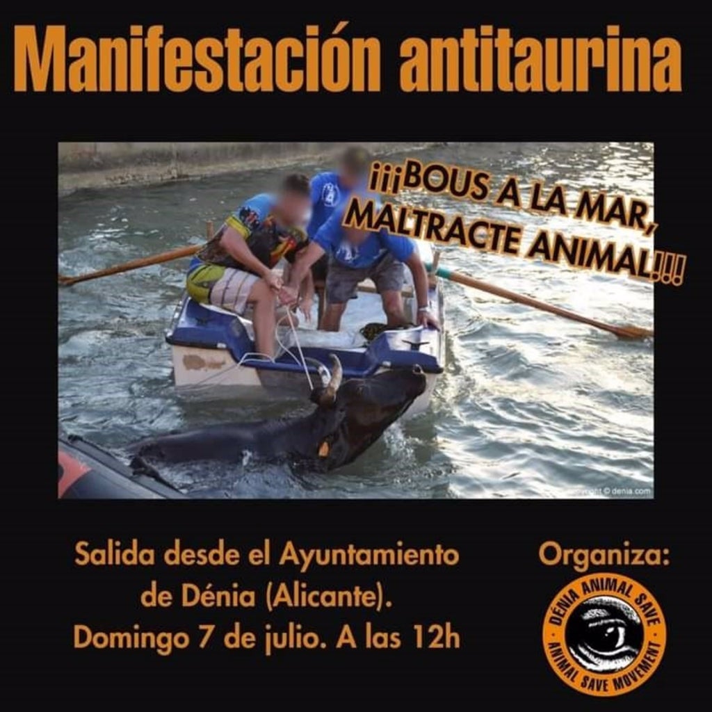 Dénia Animal Save ha organitzat una manifestació aquest diumenge, 7 de juliol, a Dénia contra els bous a la mar. El recorregut començarà a les 12 h hores a les portes de l’Ajuntament del municipi de la Marina Alta.