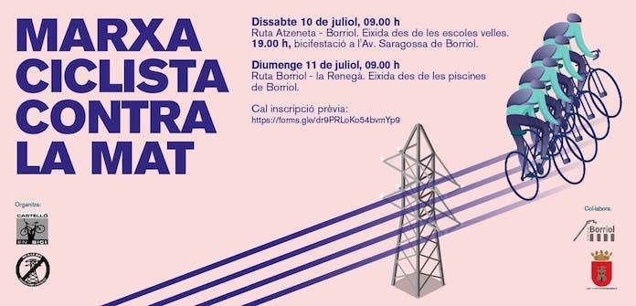 La plataforma No a la MAT a les comarques de Castelló, el col·lectiu en defensa de l’ús de la bicicleta com a eina de mobilitat Castelló en Bici i la Plataforma Salvem la Renegà han convocat una marxa ciclista per reivindicar la protecció del territori, defensar el sector primari i protestar contra el projecte de línia de Molt Alta Tensió (MAT) entre la subestació elèctrica de Morella (els Ports) i d’Almassora (la Plana Alta).