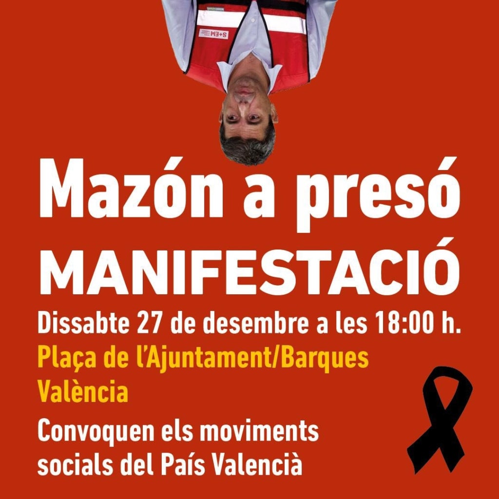 Més de 200 entitats socials, juntament amb les associacions de víctimes, els Comités Locals d’Emergència i Reconstrucció (CLER) i l’Acord Social Valencià, han convocat per a dissabte 27 de desembre una nova manifestació, amb el lema “Mazón a presó“, per a exigir que l’expresident de la Generalitat deixe l’acta de diputat i se sotmeta a la justícia per la gestió de la dana del 29 d’octubre del 2024, que va costar la vida a 230 persones al País Valencià.