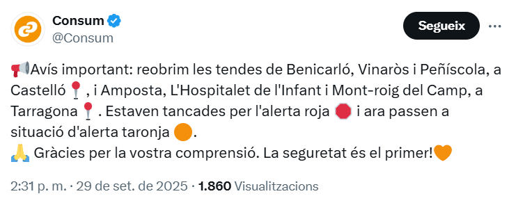 📣 Avís important: les tendes afectades per l’alerta roja a València 📌, estaran tancades fins que la situació d’alerta roja passe.