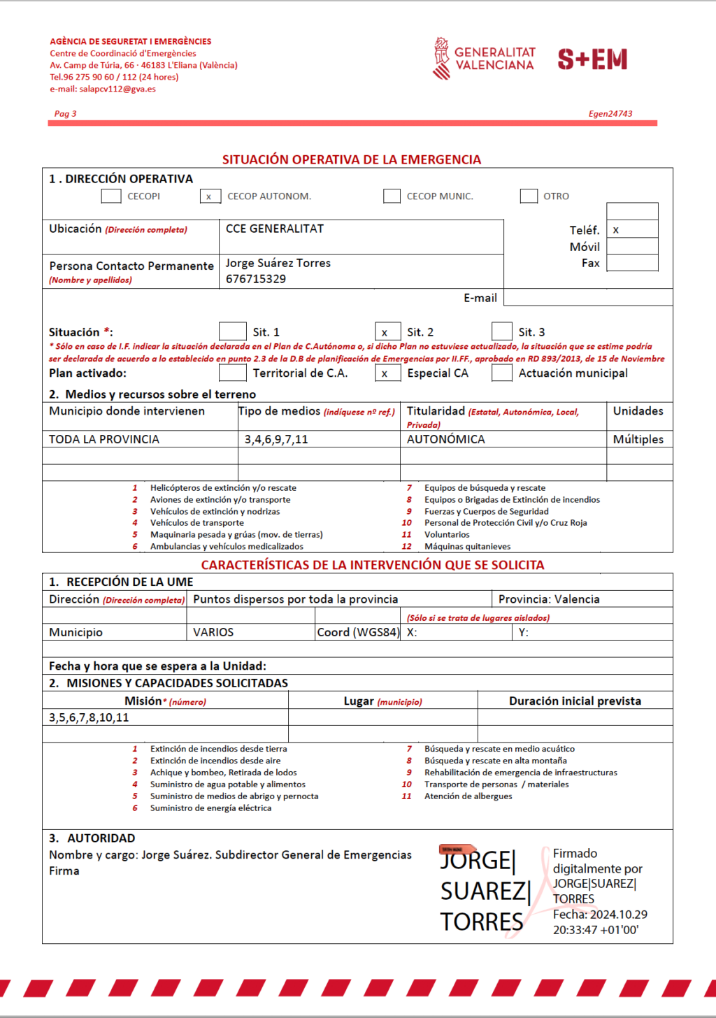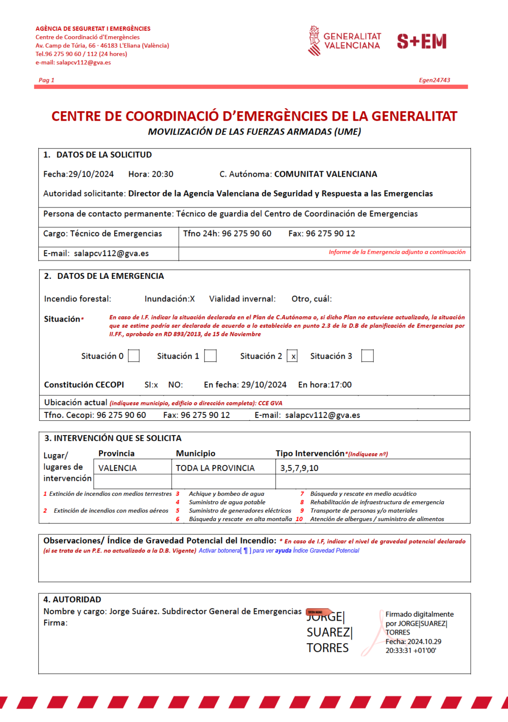 Així mateix, es detalla la situació operativa de l’emergència, amb la direcció “autonòmica” situada al CCE de la Generalitat, i l’activació de la situació 2 i del pla especial autonòmic. Per tot això, se sol·licita la intervenció de l’UME en “punts dispersos per tota la província” per a dur a terme diverses missions, entre les quals traure aigua; retirar llot; subministrar energia elèctrica, o cercar i rescatar en medi aquàtic i en alta muntanya.