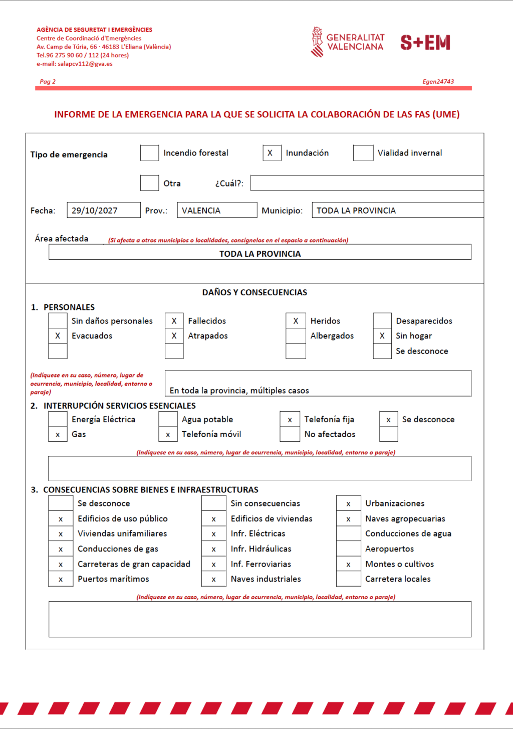 Concretament, en l’informe del CCE s’especifiquen les dades de l’emergència -situació 2-, el tipus -inundació- i la intervenció que se sol·licita –en tota la demarcació de València-. Respecte als danys personals i conseqüències, s’indica que existeixen evacuats, morts, atrapats, ferits i persones sense llar afectades, amb “múltiples casos”. També es concreta la interrupció de serveis essencials com ara gas, telefonia mòbil i fixa i s’afirma “desconéixer” uns altres.