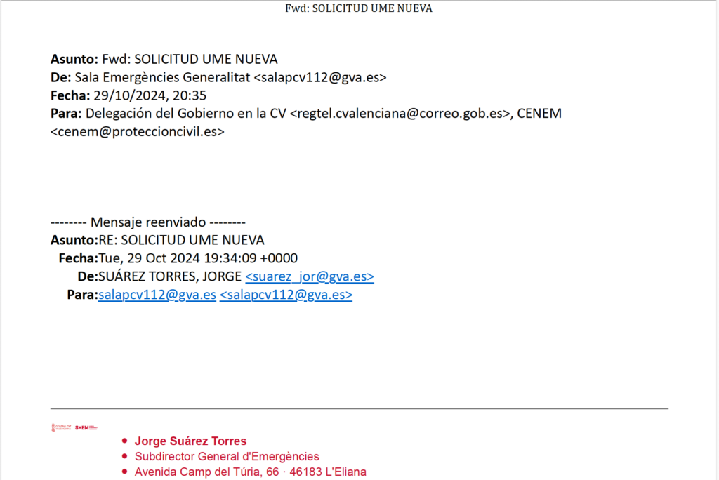El document, difós aquest dimecres per Compromís, es va enviar des de la sala del 112 a la Delegació del Govern espanyol al País Valencià via correu electrònic a les 20.35 hores per a sol·licitar una nova mobilització de la Unitat Militar d’Emergències (UME).