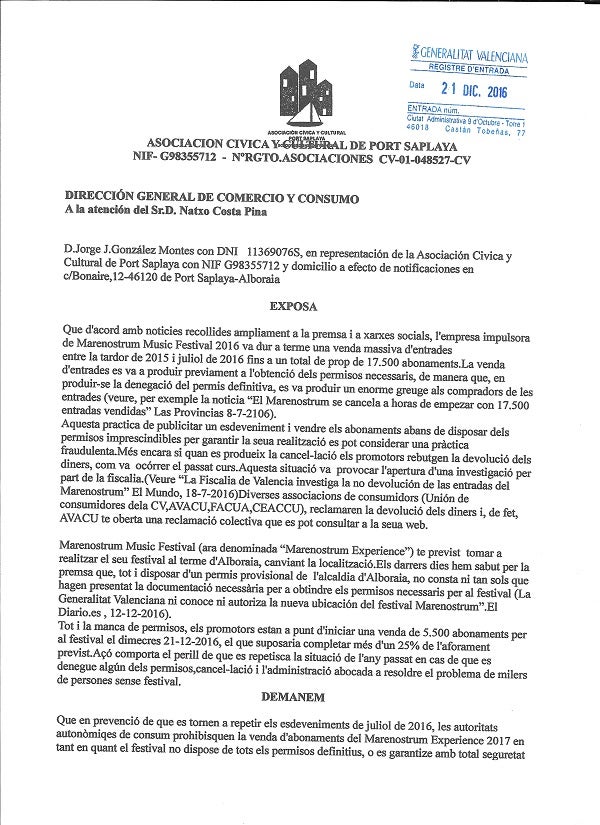 El promotors de Marenostrum music Festival -ara denominada ‘Marenostrum experience‘- tot i disposar d’un permís provisional de l’alcaldia d’Alboraia i sense que “tan sols hagen presentat la documentació necessària per a obtindre els permisos necessaris” per al festival, “estan a punt d’iniciar una venda de 5.500 abonaments per al festival el dimecres 21-12-2016, el que suposaria completar més d’un 25% de l’aforament previst”, s’alerta en l’escrit, la qual cosa, “comporta el perill que es repetisca la situació de l’any passat en cas que es denegue algun dels permisos, cancel·lació i l’administració abocada a resoldre el problema de milers de persones sense festa”.