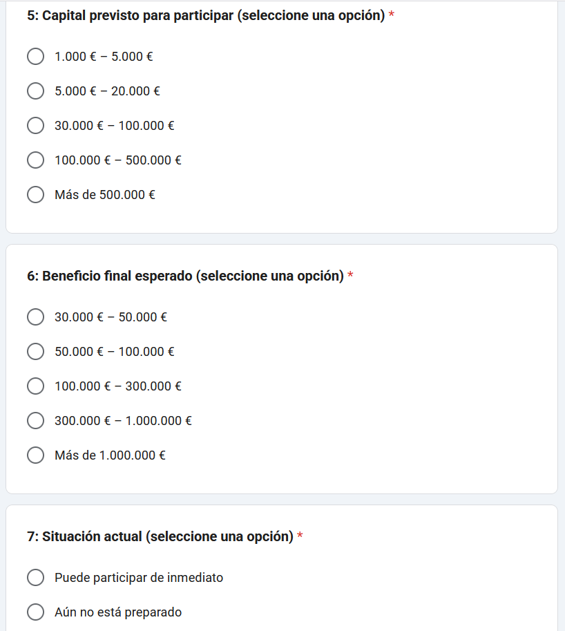 De fet, malgrat que, com déiem, el curs és gratuït, aquest no és sinó un mecanisme per aconseguir inversors per al fons de Jump Trading Europe BV. De forma regular, “l’assistent” Sofia Silva passa l’enllaç a un qüestionari on es pregunta per la quantitat a invertir, que va des dels 1.000 als 500.000 euros.