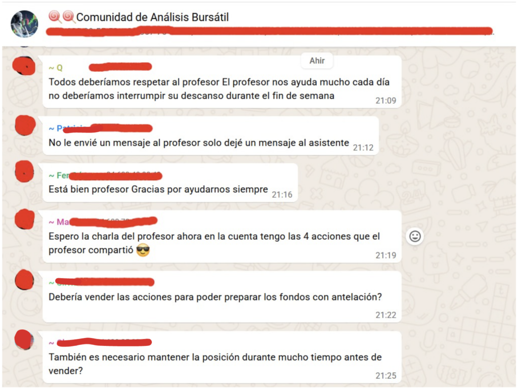 Només introduir-te al grup et rep un missatge sobre assessorament financer i accions. Seguidament, una membre identificada com Adriana pregunta “què és aquest grup?”. Als pocs minuts, un altre membre sense nom respon: “Sembla que és un grup d’intercanvi d’accions. Ja he fet clic a l’enllaç d’invitació dalt per unir-me al grup intern”. Vaja, tot un clàssic dels venedors d’ungüents miraculosos: un suposat espectador neutral que ha provat el producte i li ha agradat tant que ja vol repetir.