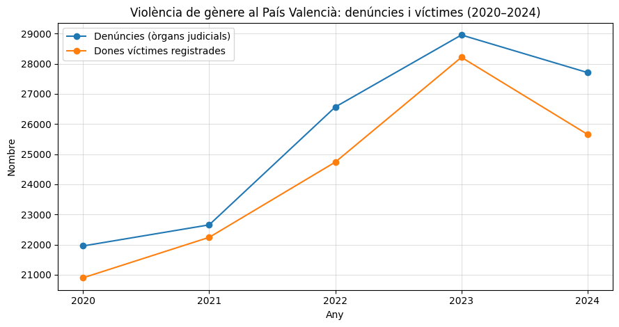 El País Valencià registra una pujada sostinguda de la violència masclista entre 2020 i 2023 i tanca 2024 amb un descens respecte del pic de l’any anterior, segons les estadístiques anuals del CGPJ difoses pel TSJ valencià: les denúncies passen de 21.954 el 2020 a 28.955 el 2023 i baixen fins a 27.708 el 2024, mentre que les dones víctimes registrades evolucionen de 20.897 a 28.214 i reculen després fins a 25.656.