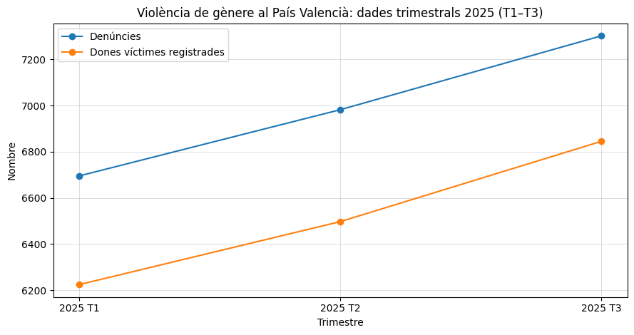 El País Valencià acumula 20.979 denúncies i 19.566 dones víctimes registrades per violència masclista en els tres primers trimestres del 2025, segons les estadístiques del CGPJ difoses pel TSJ valencià: el primer trimestre (gener-març) tanca amb 6.695 denúncies i 6.224 víctimes, el segon trimestre (abril-juny) suma 6.982 denúncies i 6.497 víctimes, i el tercer trimestre (juliol-setembre) enregistra 7.302 denúncies i 6.845 víctimes, unes xifres que apunten a un repunt de l’activitat judicial a l’estiu mentre el balanç anual queda pendent de la publicació del quart trimestre. 2025 tanca el tercer trimestre amb 20.979 denúncies i 19.566 víctimes al País Valencià, a l’espera del balanç anual.