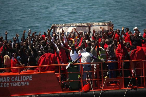 Un gran grup d’immigrants a bord de l’embarcació de Salvament Marítim.