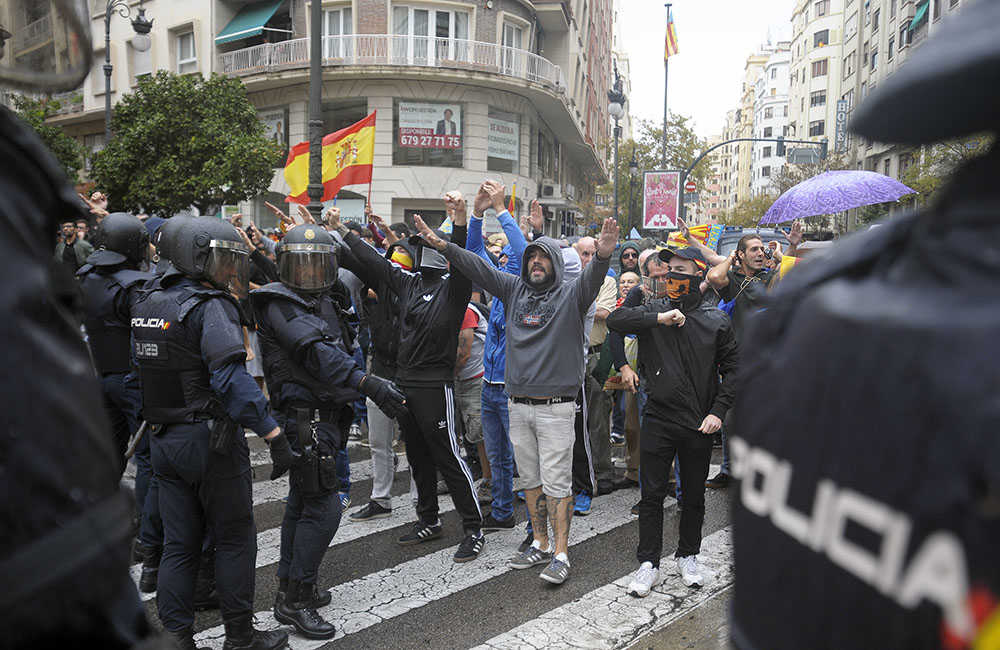 El passat 9 d’Octubre, malgrat el fort dispositiu policial desplegat a València durant tota la jornada de la Diada del País Valencià, un grup d’aproximadament 12 persones van atacar dos joves als voltants del pont d’Aragó. Els agents van aïllar simpatitzants d’España 2000 i Alianza Nacional a la plaça Sant Agustí davant la negativa d’aquestos d’iniciar la marxa convocada a les 16.30 hores per l’Associació Regne de València de Gais i Lesbianes. Els ultres, encapçalats pels líders d’ambdós partits –José Luis Roberto i Pedro Pablo Peña– van ser arraconats per tal d’establir un cordó de seguretat a la plaça Sant Agustí perquè la manifestació de la Comissió 9 d’Octubre poguera eixir a les 18.30 hores a la zona autoritzada. Tanmateix, no es van poder frenar totes les agressions, ja que es va llançar una bengala amb gasos lacrimògens contra els periodistes i els primers manifestants que acudien al punt d’eixida de la marxa.