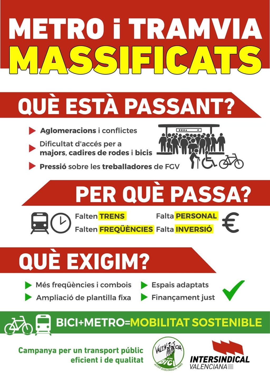 Les organitzacions recorden que “ni València ni Alacant reben el nivell de finançament que tenen altres àrees metropolitanes com Madrid o Barcelona, i reclamen un millor finançament del transport públic al País Valencià”. Així doncs, exigeixen “un augment significatiu del pressupost de FGV per a incorporar nous combois amb més capacitat, millorar l’accessibilitat i ampliar les freqüències”.