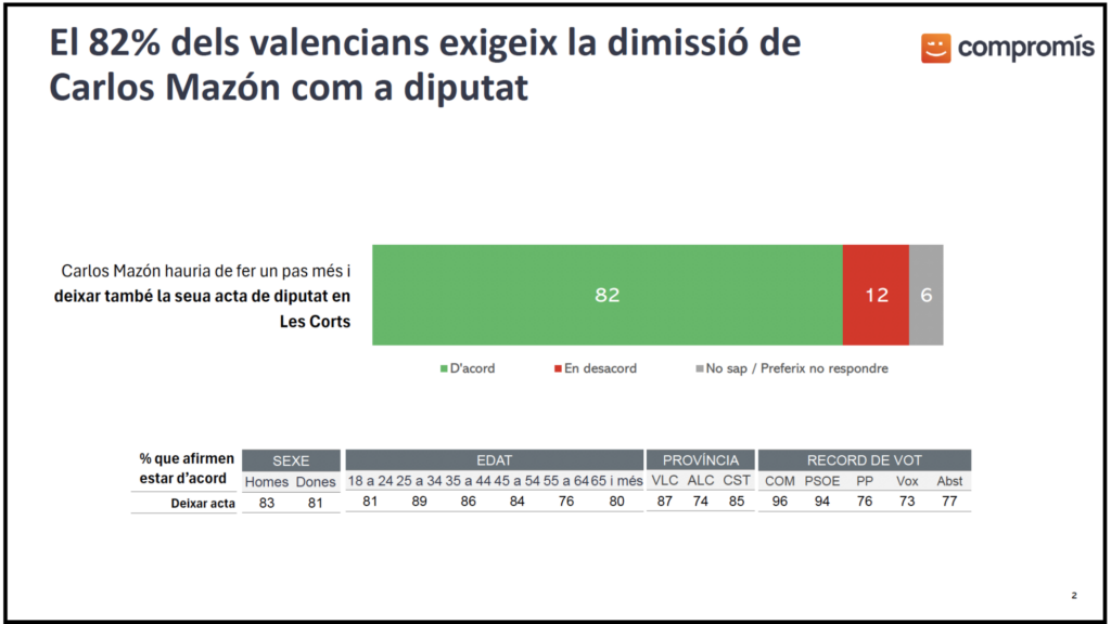 Una enquesta encarregada per Compromís assenyala que el 82% dels valencians exigeix la dimissió de l’expresident de la Generalitat Carlos Mazón com a diputat del PP a Les Corts, segons ha indicat el síndic de la coalició, Joan Baldoví, que ha remarcat que es tracta d’una xifra “absolutament incontestable” i ha demanat a l’excap del Consell que “se’n vaja a sa casa”.