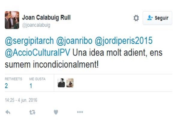 Però, la petició no està només tenint suports i empenta de manera presencial, sinó que les xarxes socials estan servint per mostrar adhesions, com en el cas de Joan Calabuig i els socialistes de la ciutat de València, els quals a través de Twitter van dir sobre l’avinentesa: “Una idea molt adient, ens sumem incondicionalment”.