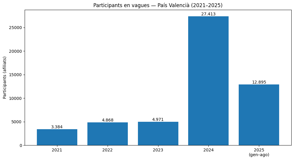 Les dades oficials del Ministeri de Treball apunten que les protestes sindicals al País Valencià han fet un salt fort en l’últim bienni si es mira el volum d’afiliats que han secundat vagues: 3.384 participants en 2021 i 4.868 en 2022. El resultat és que es manté pràcticament estable en 2023 (4.971), i una pujada molt marcada en 2024 (27.413). El 2025 (gener-agost), amb dades provisionals, la xifra baixa a 12.895 afiliats participants. En jornades no treballades, el 2021 en suma 6.897 al País Valencià; i, segons els mateixos butlletins, els valors estimats per al 2022 i el 2023 ronden les 10.000 jornades, mentre que 2024 s’enfila cap a les 29.000 (per l’augment de participants, tot i que la durada mitjana per participant és menor).