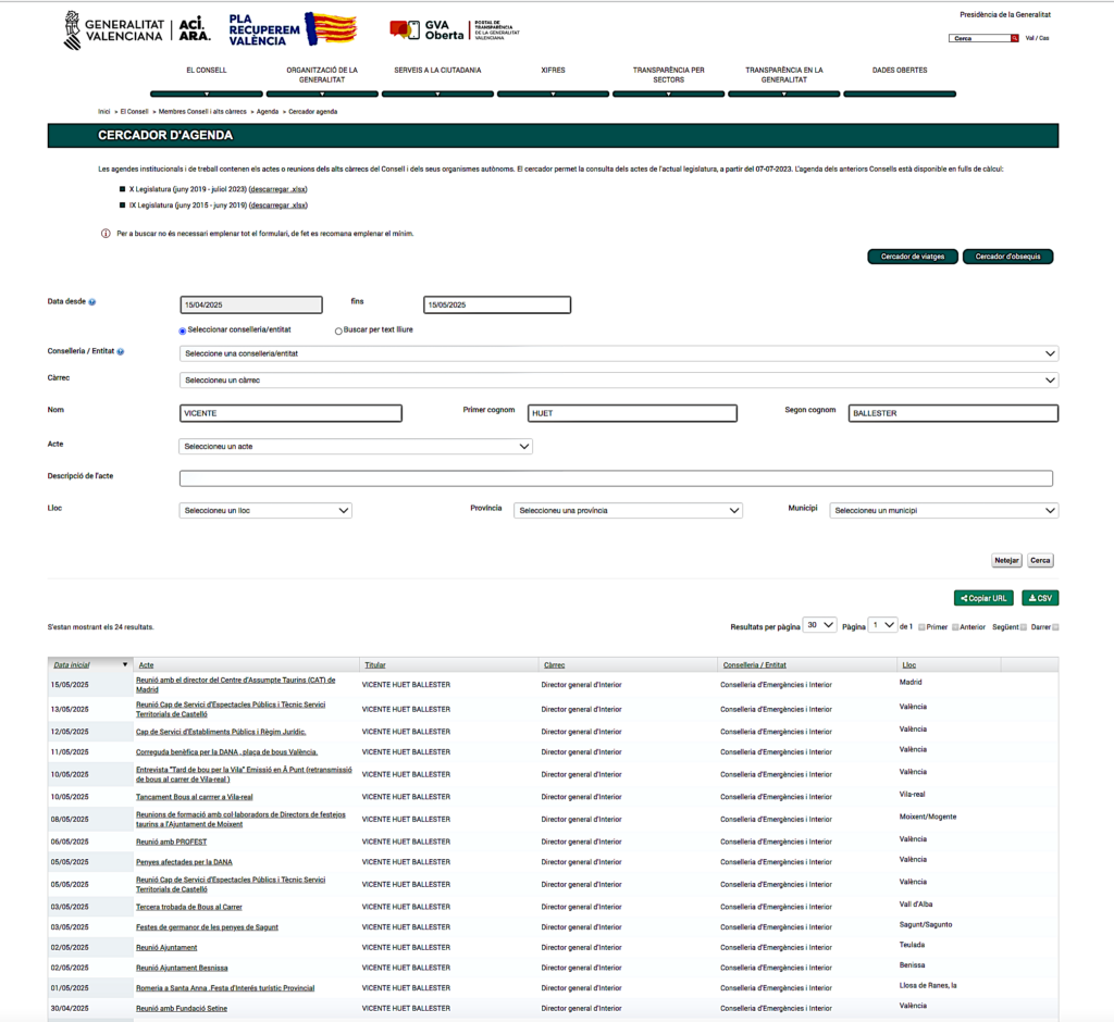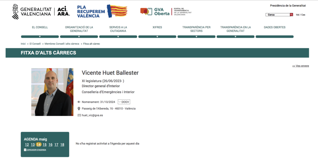 Vicente Huet no tenia cap activitat en l’agenda oficial el 14 de maig i aquest dijous, 15 de maig, hi consta una reunió amb el director del Centre d’Assumptes Taurins (CAT) de Madrid a les 13 h. Cal recordar que Huet va ser nomenat director general d’Interior, un càrrec que feia tres mesos que estava vacant i que té competències en la gestió de la policia, la seguretat pública, la protecció civil i també les festes i els espectacles, el 29 d’octubre del 2024, el dia de la dana, i que per a la designació es va tindre en compte el seu ampli coneixement «de la idiosincràsia de les festes taurines i, en especial, dels bous al carrer». De fet, com es pot comprovar, bona part de la seua activitat està centrada en afers taurins.