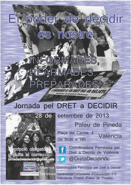 El 28 de setembre la Coordinadora Feminista pel Dret a Decidir de València organitzarà la Jornada ‘El poder de decidir és nostre. Informades, rearmades, preparades’ al Palau de Pineda de València. “Una jornada de reflexió i debat al voltant del dret de les dones a decidir si volen ser mares o no”, expliquen des de l’organització.