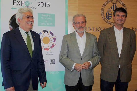 El rector de la Universitat de València, Esteban Morcillo; el coordinador del CSIC al País Valencià, José Pío Beltrán; i el director del Parc Científic, Juan Antonio Raga, han presentat aquest dijous la setena edició d’Expociència, una jornada de portes obertes al Parc Científic i una festa de la ciència oberta a tot el públic, que se celebrarà el pròxim dissabte.