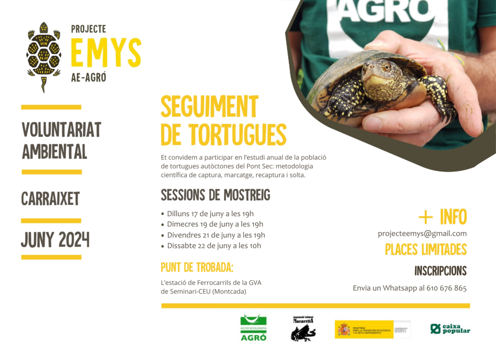 Del 17 al 22 de juny el Projecte Emys d’Acció Ecologista-Agró, iniciativa de ciència ciutadana que compta amb la col·laboració de la Generalitat Valenciana i, des de 2021, també amb el suport de Caixa Popular, torna al Barranc del Carraixet per a continuar amb l’estudi i seguiment de la població de tortugues d’aigua ibèriques (Mauremys leprosa) del Pont Sec.