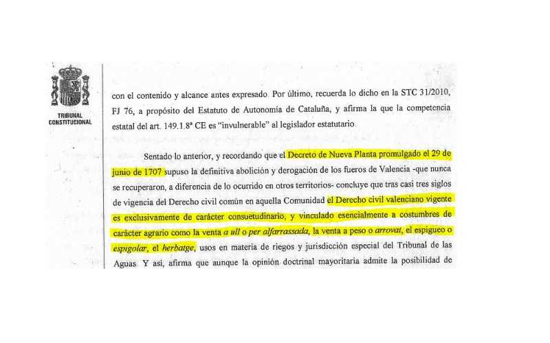 El mateix text del TC espanyol detalla que “després de quasi tres segles de vigència, el dret civil valencià està vinculat essencialment a costums agraris” i, per això, considera que cal eliminar-lo.