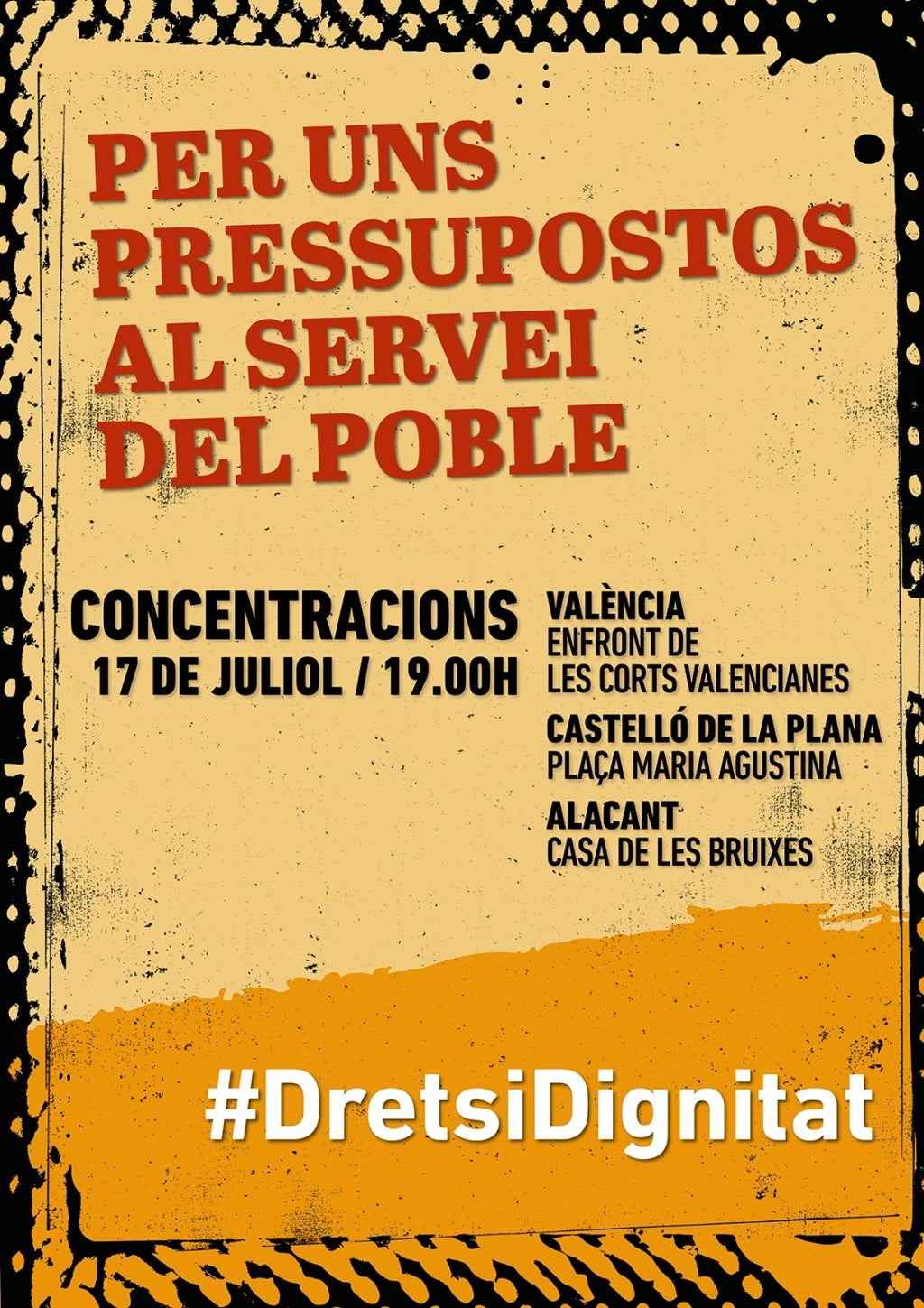El moviment social valencià convoca una gran protesta el 17 de juliol contra els pressupostos “de la destrucció”. El moviment sindical, veïnal, social, feminista, LGTBI+, ecologista, educatiu, memorialístic i de cooperació ha unit forces per convocar una gran mobilització simultània el dijous 17 de juliol a les 19 h en diversos punts del País Valencià. Amb el lema “Per uns pressupostos al servei del poble” i el sublema #DretsiDignitat, la protesta tindrà lloc davant de les Corts Valencianes a València, a la plaça Maria Agustina de Castelló (la Plana Alta) i a la plaça de les Bruixes d’Alacant (l’Alacantí).