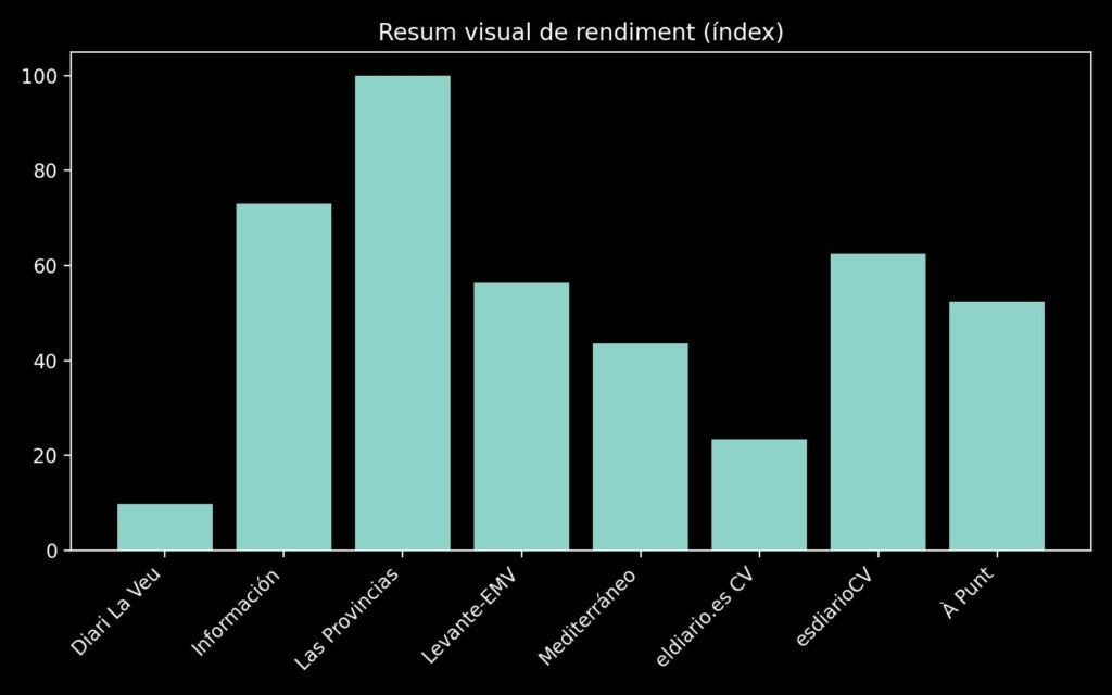 L’anàlisi combina dades absolutes —visualitzacions totals i abast— amb indicadors relatius, com la mitjana de visualitzacions per vídeo o la interacció acumulada per cada mil visualitzacions. Aquest enfocament permet comparar mitjans grans i xicotets de manera més justa i observar com no tots capitalitzen igual els grans esdeveniments. Davant episodis com una dana, una mobilització social o una polèmica institucional, alguns mitjans multipliquen l’impacte mentre altres passen més desapercebuts.