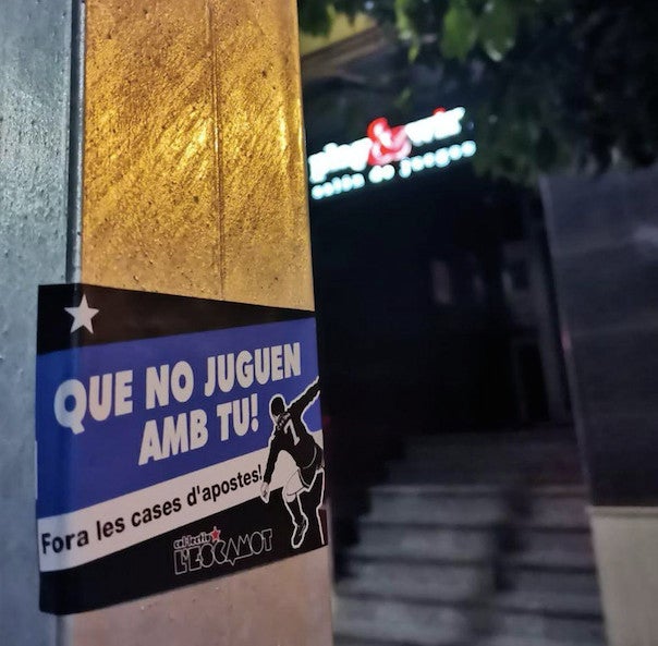 Les apostes entren als carrers, però també ho fan a les cases a través del joc en línia. Mai havia sigut tan fàcil i còmode apostar. Si aquests negocis continuen prosperant, és perquè més i més gent és usuària dels seus serveis. Tothom coneguem algú que acudeix regularment a aquests establiments o que aposta en línia de manera habitual. Però la realitat és que aquests negocis tenen conseqüències negatives per als barris i les persones que els habiten. El que comença sent un joc prompte deixa de ser-ho. Les cases d’apostes, els jocs d’atzar i les empreses que estan darrere provoquen i fan negoci amb la ludopatia. Una patologia que consisteix en l’alteració progressiva del comportament pel qual l’individu experimenta la necessitat de jugar, per damunt de qualsevol problema que això puga suposar per a ell o ella i per als seus i les seues. Aquesta malaltia pot afectar greument l’economia dels ludòpates i les seues famílies, arribant en molts casos a la ruïna o fins i tot a comportaments delictius.