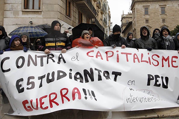 La pancarta ‘Contra el capitalisme l’estudiantat en peu de guerra!’ de l’Assemblea Interuniversitària obria la protesta al costat d’altres com ‘Des de les aules destruïm el capital, cap a la vaga general indefinida’, xiulets i el cant de consignes com “hui hi ha vaga, l’educació no és paga”, “menys corrupció i més educació”, “fa falta ja una vaga general” o “revolució”.