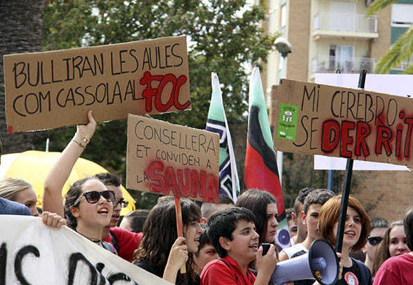 Durant la protesta s’han pogut veure pancartes com ‘Condicions dignes per a l’escola pública. LOMQE No, Català i Wert dimissió’, ‘Consellera, et convidem a la sauna’, ‘El meu cervell es fon’, ‘Bulliran les aules com cassola al foc’ o ‘les classes es fonen i es ho permeten’.
