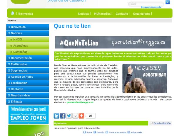 Per la seua banda, Joves Socialistes del País Valencià (JSPV) celebra que la Fiscalia Provincial de València haja obert finalment diligències d’investigació penal sobre la campanya #quenotelíen, engegada per les Noves Generacions (NNGG) del PP de Castelló el passat mes de març.