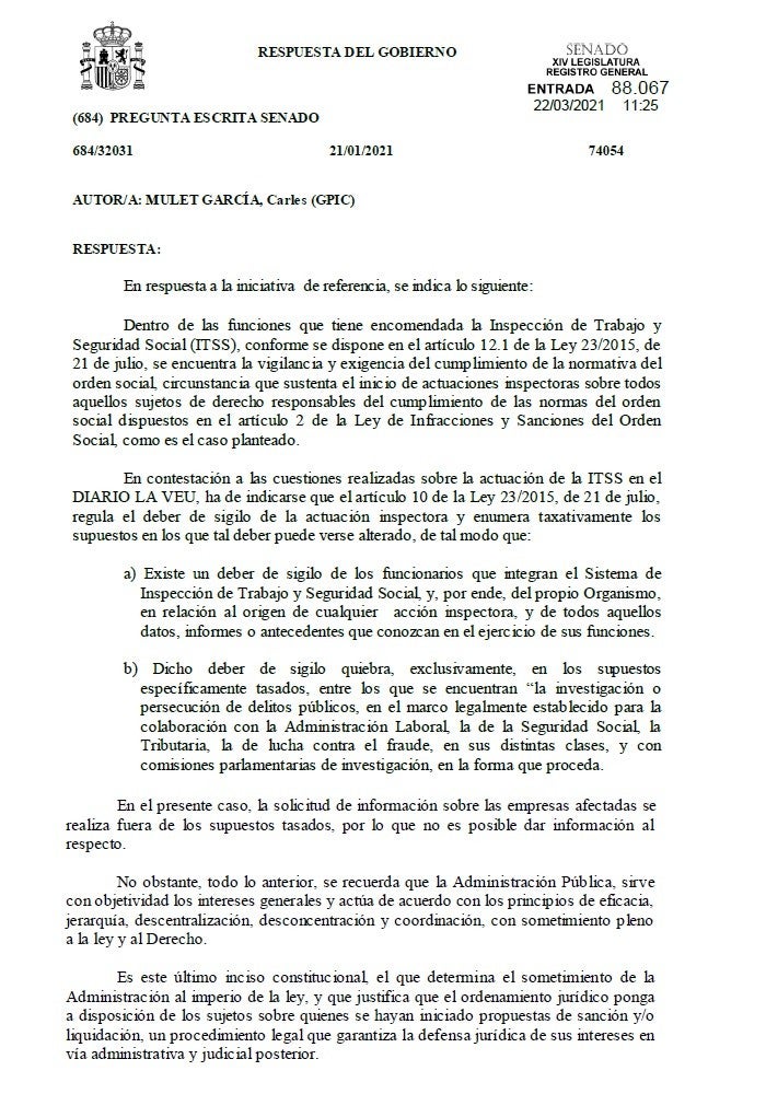 Aquest dimarts 22 de març, el Govern espanyol ha respost al senador sobre «les qüestions de la Inspecció de Treball al DIARIO LA VEU». En l’escrit, s’hi indica que «l’article 10 de la Llei 23/2015, de 21 de juliol, regula el deure de sigil de l’actuació inspectora i enumera taxativament els supòsits en els quals pot veure’s alterats».