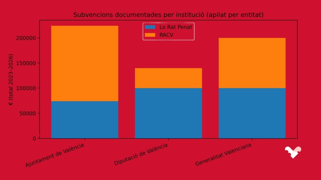 L’Ajuntament de València, la Diputació de València i la Generalitat Valenciana han aprovat ajudes i subvencions nominatives a la Real Acadèmia de Cultura Valenciana (RACV) i a Lo Rat Penat que sumen 564.200 euros en el tram 2023–2026, segons els acords i resolucions publicats en portals institucionals i en el Diari Oficial de la Generalitat Valenciana (DOGV). És a dir, en el que es porta de legislatura han regalat mig milió d’euros a aquests xiringuitos anticiència que neguen el valencià i l’estudi filològic a les universitats. L’import global reparteix 290.000 euros a la RACV i 274.200 euros a Lo Rat Penat, amb la major part concentrada en la Generalitat Valenciana (200.000 euros) i l’Ajuntament de València (224.200 euros).