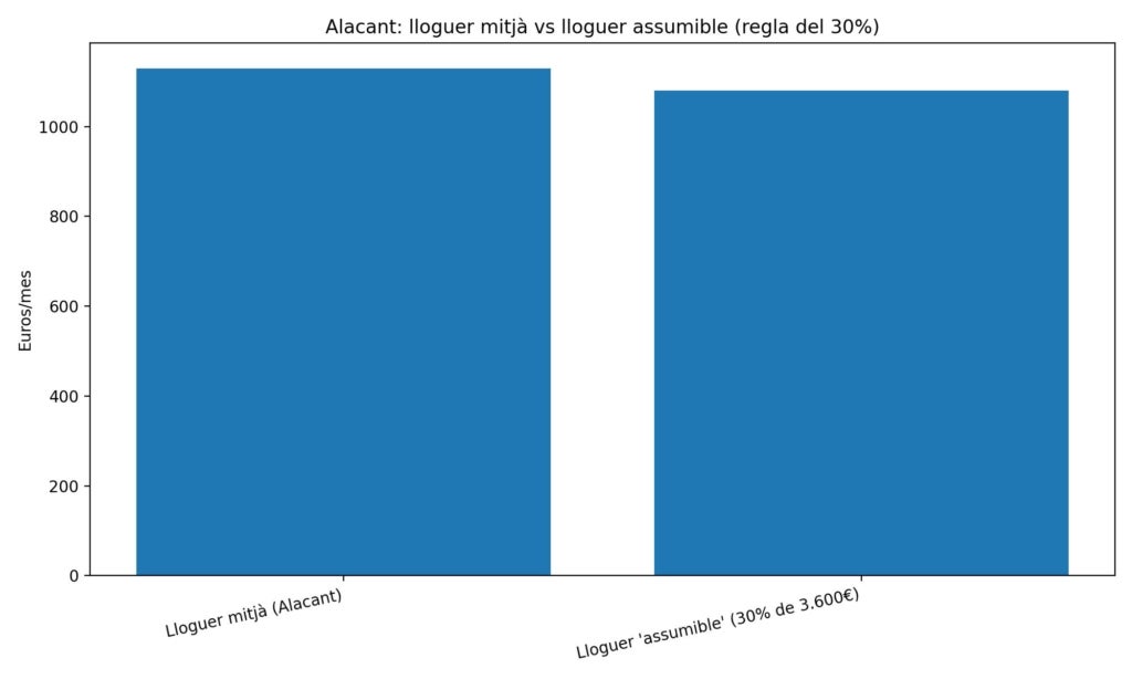 El sindicat ha advertit que accedir a un habitatge de lloguer a Alacant, Benidorm (la Marina Baixa) o Dénia (la Marina Alta) “implica destinar més de la meitat del salari” i ha remarcat que, en el cas del jovent, l’esforç s’enfila “entre el 60% i el 90%”, una realitat que “converteix els treballadors i les treballadores en pobres amb ocupació”. Segons les dades exposades, per complir la recomanació de no superar el 30% del salari destinat al lloguer, caldrien 3.600 euros nets mensuals a Alacant, on el lloguer mitjà ja arriba als 1.130 euros al mes.