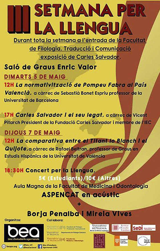 – Durant tota la setmana a l’entrada de la Facultat de Filologia, Traducció i Comunicació exposició de Carles Salvador.
