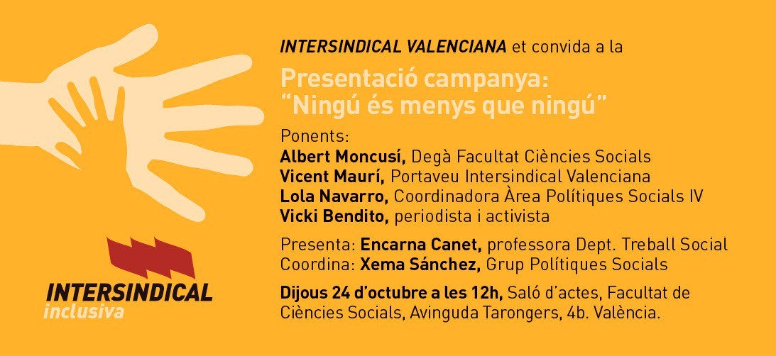 Intersindical Valenciana a través del seu Grup de Polítiques Socials i del seu projecte Intersindical Inclusiva presentarà el pròxim 24 d’octubre a les 12 hores en la Universitat de València (Facultat de Ciències Socials) la campanya “Ningú és menys que ningú”.