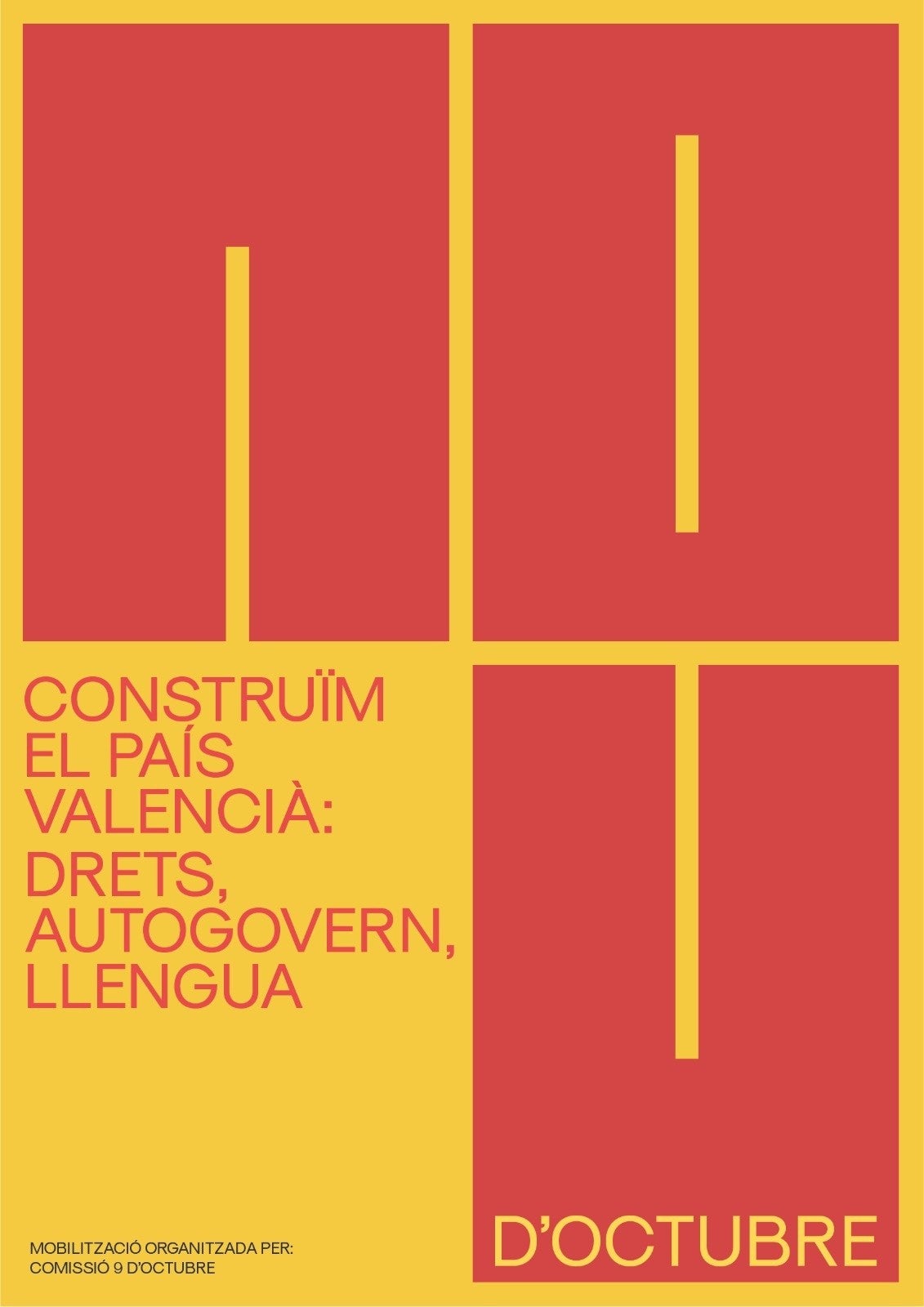 La Comissió 9 d’Octubre està formada per les entitats Acció Cultural del País Valencià (ACPV), Associació Cívica Valenciana (ACV) Tirant lo Blanc, Ca Revolta, Decidim, Escola Valenciana, Fundació Nexe, Plataforma per la Llengua, Societat Coral El Micalet; els sindicats estudiants Bloc d’Estudiants Agermanants (BEA) i A Contracorrent; els sindicats CCOO-PV i Intersindical Valenciana; i els partits Compromís, ERPV, EUPV i Podem.