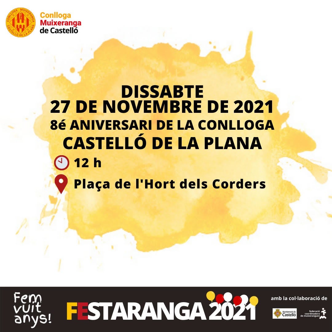 La Conlloga Muixeranga de Castelló de la Plana celebrarà els seus huit anys amb una actuació a la plaça de l’Hort dels Corders aquest dissabte, 27 de novembre, a les 12 h. Aquesta actuació serà la primera que ofereix la Conlloga després de l’any i mig d’aturada obligada. Per això, el col·lectiu ha assenyalat que «els seus membres tenen moltes ganes i il·lusió després d’haver pogut reiniciar els assajos amb l’objectiu de tornar a les places.